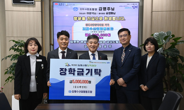 김제수산업협동조합은 지난해부터 꾸준히 김제사랑장학재단에 장학금을 기탁하며, 지역사회의 미래를 함께 키워가는 사회공헌 활동을 이어오고 있다.