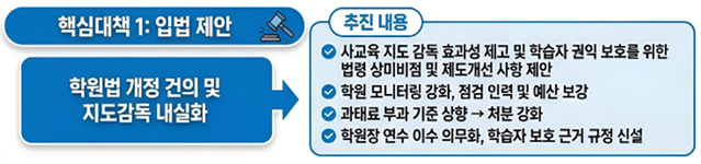 아울러 과도한 사교육을 조장하는 행위에 대한 지도·감독이 현장에서 실질적으로 작동할 수 있도록 관리·감독을 강화하고, 학습자 보호를 위한 근거 규정의 신설·개정도 요청할 예정이다.