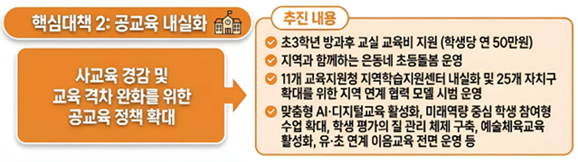 아울러 사교육을 대체할 수 있도록 공교육의 내실을 다지기 위해 △방과후·돌봄 운영 확대 △기초학력 지원 체계 강화(학습진단성장센터 확대) △EBS 수준별 강좌 제공 확대 △맞춤형 AI·디지털 교육 활성화 △미래역량 중심 학생 참여형 수업 확대 △학생 평가의 질 관리 체제 구축 △직업계고 학생 수요에 맞춘 프로그램 다양화 △예술·체육교육 활성화 △유·초 연계 이음교육의 전면 운영 등을 추진한다.