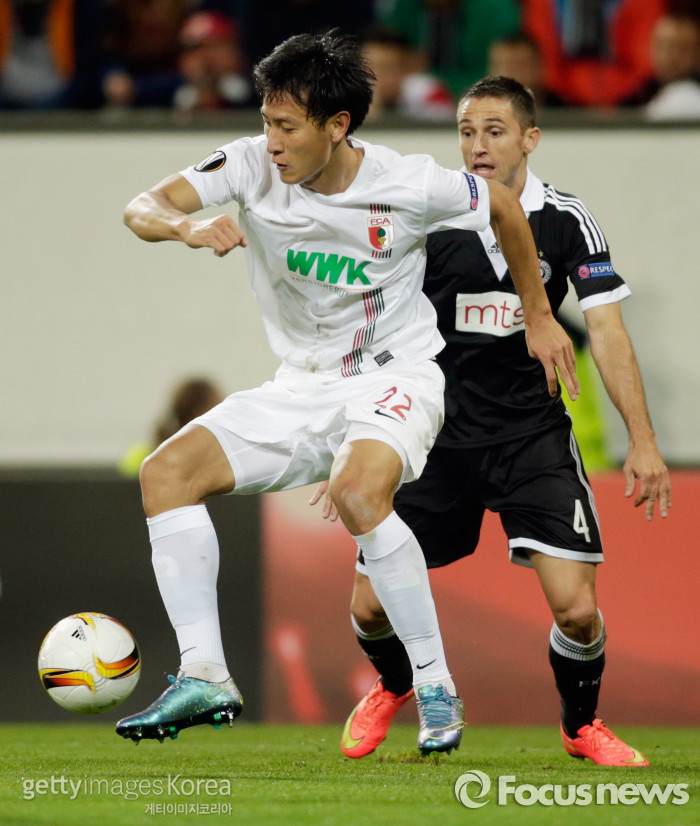 | △ <아우크스부르크/독일=게티/포커스뉴스> 아우크스부르크 소속 지동원이 10월2일 새벽(한국시간) 홈에서 열린 파르티잔과의 유로파리그 조별라운드에서 상대 수비수와 일대일 대결을 펼치고 있다. (C)게티이미지/멀티비츠 |