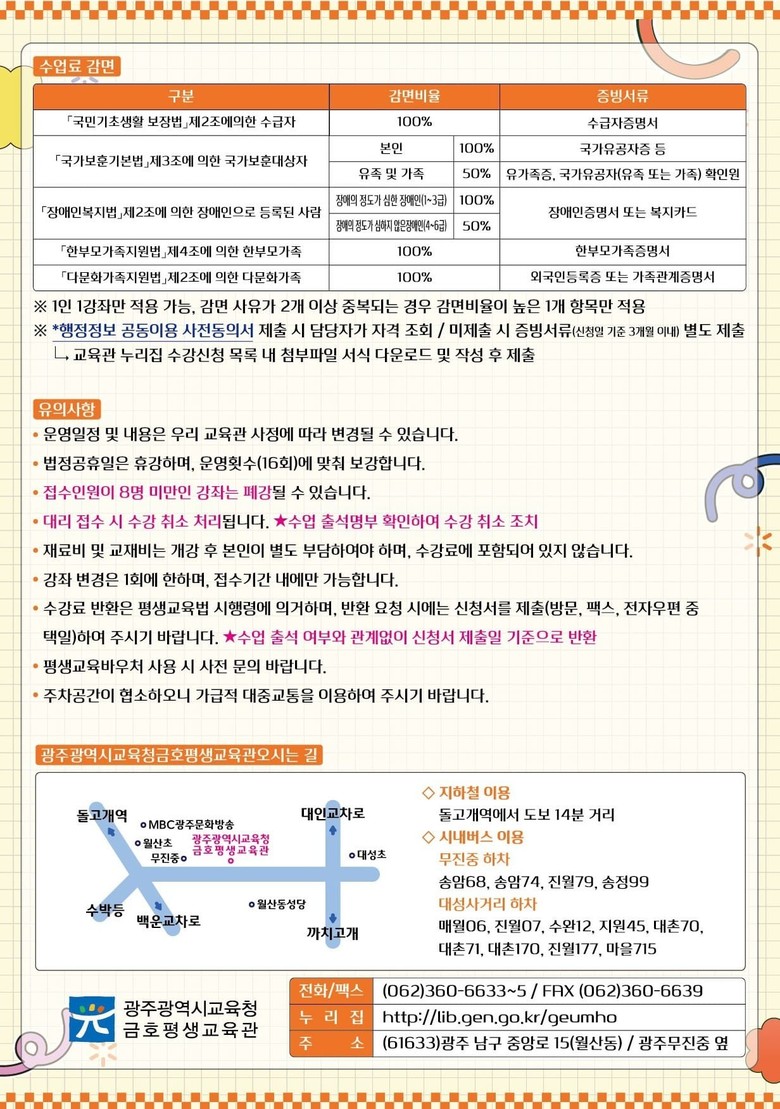 자세한 내용은 금호평생교육관 누리집(https://lib.gen.go.kr/geumho/) 또는 운영과(062-360-6633~5)에서 확인하면 된다.