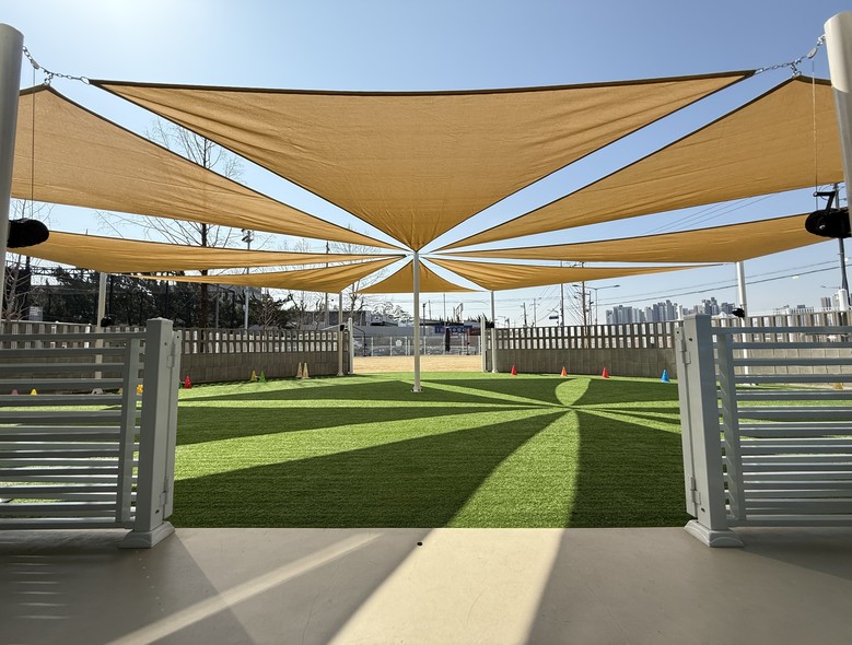 구는 우선 인조잔디가 깔린 프로그램 공간 전반에 대형 그늘막을 설치했다. 이를 통해 한여름 뜨거운 햇볕을 차단하고, 여름철 반려견의 발바닥 화상 위험을 줄이는 등 이용 환경을 대폭 개선했다.