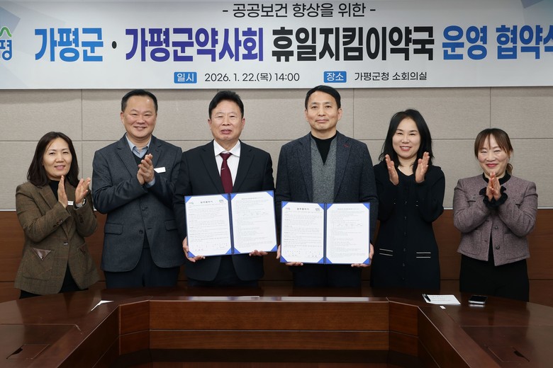 가평군과 가평군약사회는 22일 가평군청에서 ‘휴일지킴이약국 운영 업무협약’을 체결하고 공공보건 향상을 위한 협력체계를 강화하기로 했다.