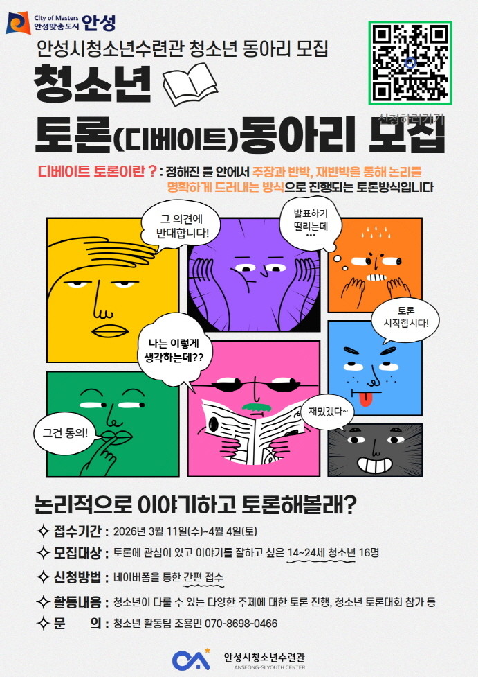 ○ 4월 4일까지 모집 포스터 내 QR코드(네이버폼) 통해 간편 신청 [안성시 세계타임즈=송민수 기자] 안성시청소년수련관(관장 조인호)은 청소년들의 논리적 사고력 증진과 올바른 의사소통 문화 정착을 위해 ‘청소년 토론(디베이트) 동아리’ 참가자를 모집한다고 밝혔다.