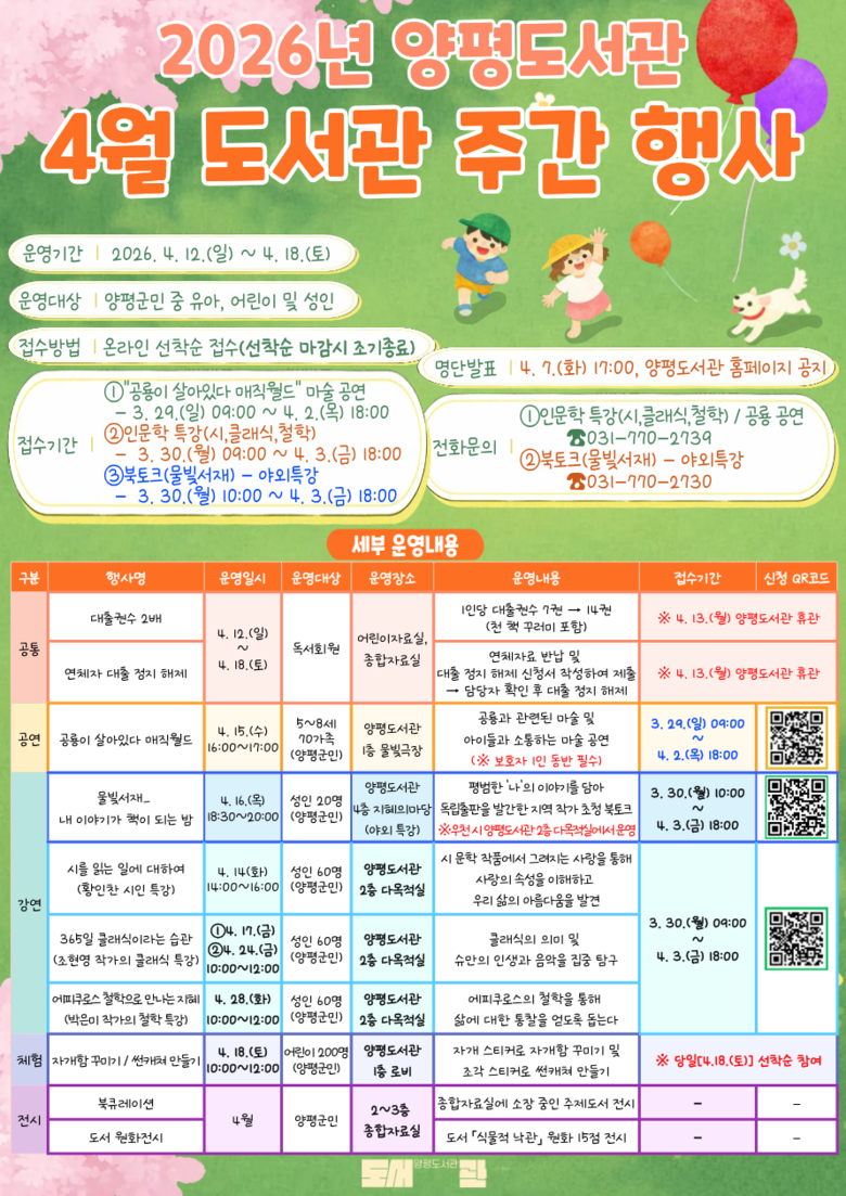 행사 기간에는 대출 권수를 2배로 확대하고, 연체자의 대출 정지를 해제하는 등 이용자 편의를 위한 혜택도 제공된다. 희망자는 모든 프로그램에 사전 접수를 통해 참여할 수 있으며, 접수는 3월 29일부터 네이버 폼을 통해 선착순으로 진행된다. 프로그램별 세부 일정은 양평도서관 누리집에서 확인할 수 있다.