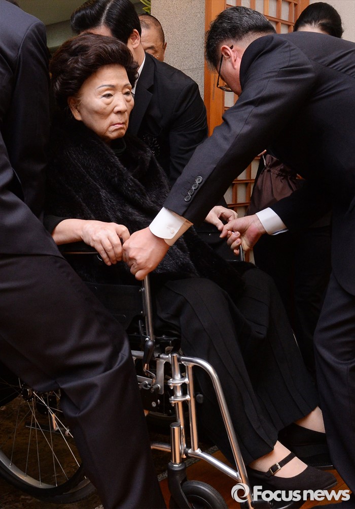 휠체어를 타고 들어선 이 여사는 부축을 받으며 자리에서 일어나 김 전 대통령의 부인인 손명순 여사·차남 현철씨와 악수를 나누며 애도를 표했다.