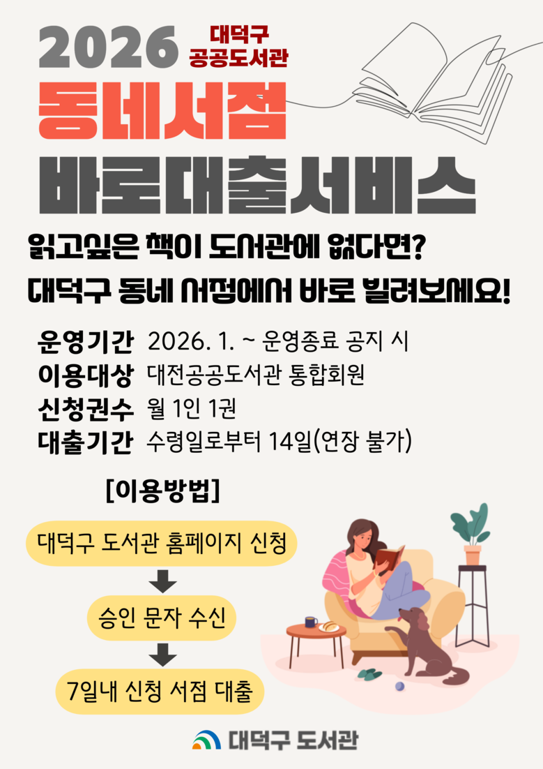 이용 대상은 대전공공도서관 통합회원이면 누구나 가능하며, 신청은 대덕구 도서관 홈페이지 ‘나의 서재 – 동네서점 바로대출’ 메뉴를 통해 가능하다.