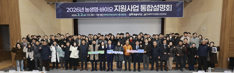 도는 2일 전북테크비즈센터에서 도내 기업 관계자 200여 명이 참석한 가운데 ‘2026년 농생명·바이오 지원사업 통합설명회’를 열었다.
