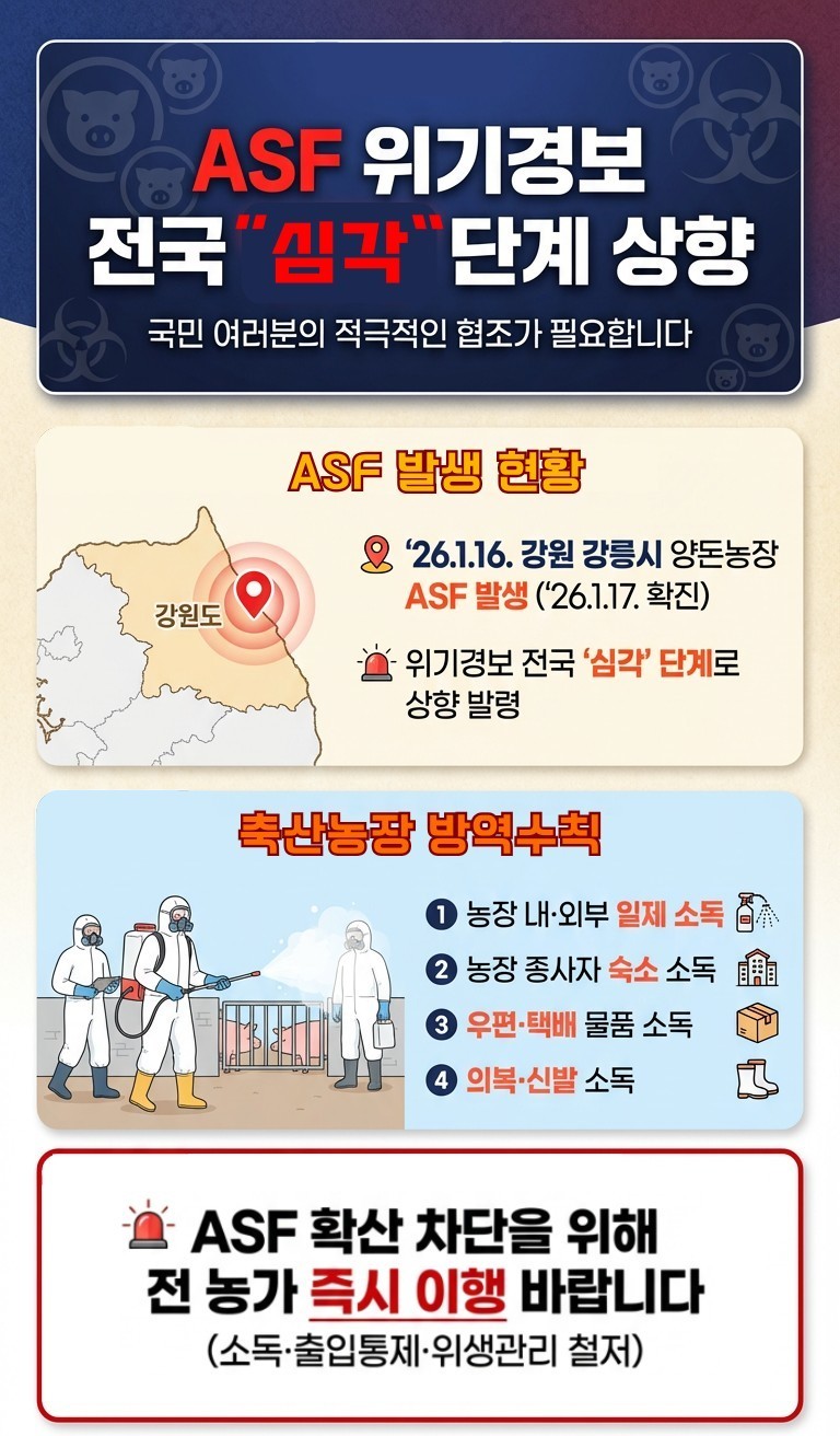 [세계타임즈=전북 이상호 기자] 전북특별자치도가 고창 양돈농장에서 발생한 아프리카돼지열병(ASF) 확산을 차단하기 위해 기존 방역 수준을 넘어선 '강화 방역체계'로 전환한다.