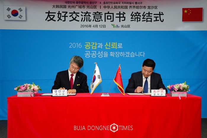 △광주 광산구와 중국 헤이룽장성 치치하얼시 룽사구가 12일 우호교류의향서를 교환하고, 두 도시의 교류협력 사업을 추진하기로 했다