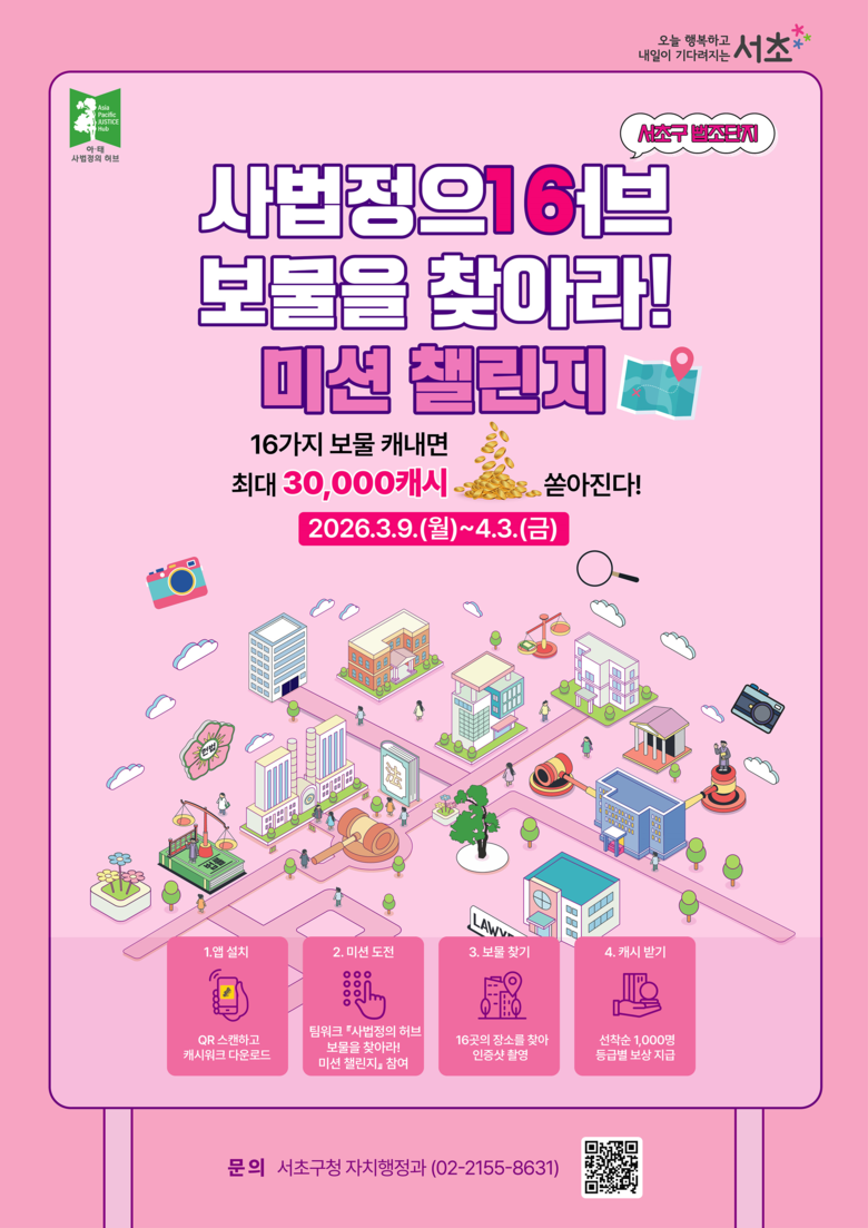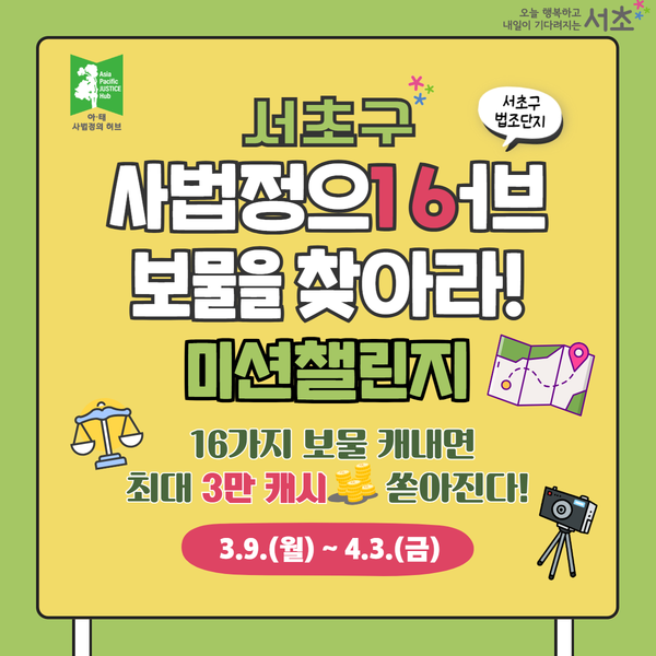 - 선착순 1,000명에게 최대 3만 캐시 지급... 3월 9일 챌린지 당일 상세 장소 전격 공개 [서초구 세계타임즈=이장성 기자] 서울 서초구(구청장 전성수)는 서초역 일대 ‘아·태 사법정의 허브’의 주요 명소를 널리 알리고 주민 참여를 확대하기 위해 3월 9일부터 4월 3일까지 약 한 달간 「사법정의 허브 보물을 찾아라! 미션 챌린지」를 진행한다고 밝혔다.