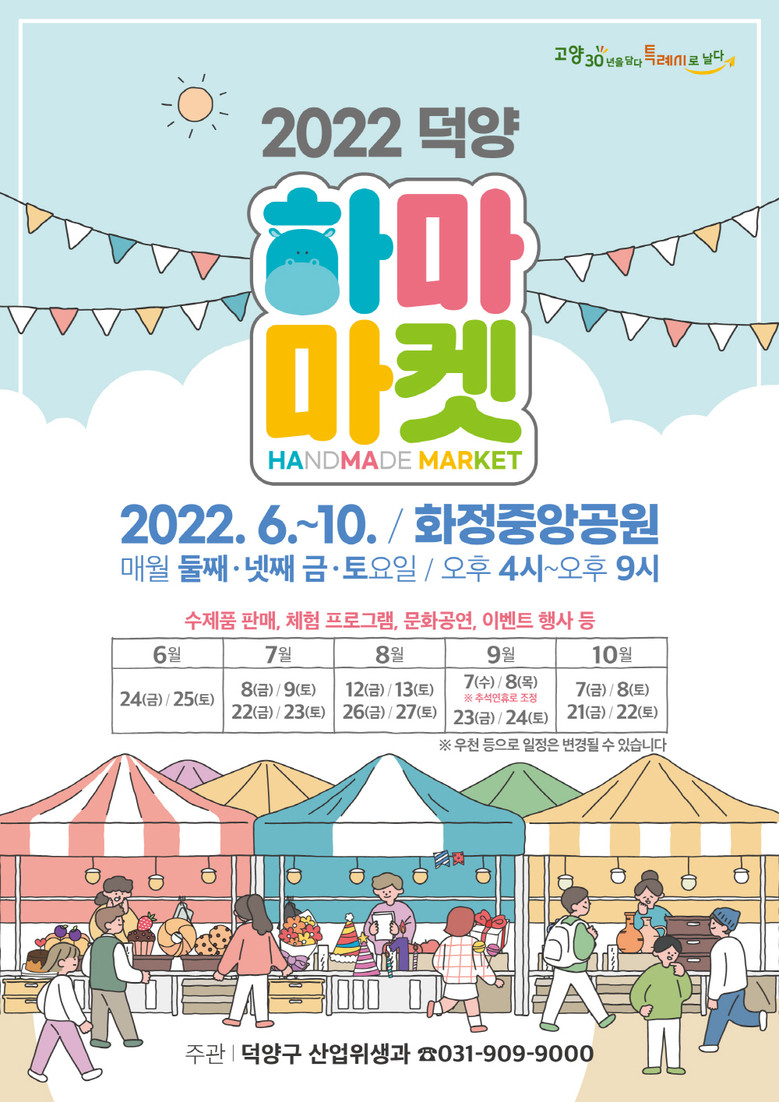 2020년도에 이어 세 번째로 개최되는 이번 행사는 수제품을 의미하는 ‘Handmade’에서 ‘ha’와 ‘ma’의 철자를 따서 하마(hama)로 이름 지어졌으며 지역주민에게 ‘하마공원’으로 알려진 화정중앙공원의 하마조각상 인근에서 오후 4시부터 9시까지 운영된다.
