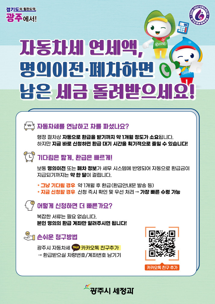 시는 이러한 불편을 해소하기 위해 ‘광주시 자동차세 카카오톡 창구’를 운영하고 있다. 카카오톡을 통해 환급을 신청할 경우 처리 기간이 최대 60일에서 3일 이내로 줄어 시민들이 보다 빠르게 환급금을 받을 수 있게 된다.