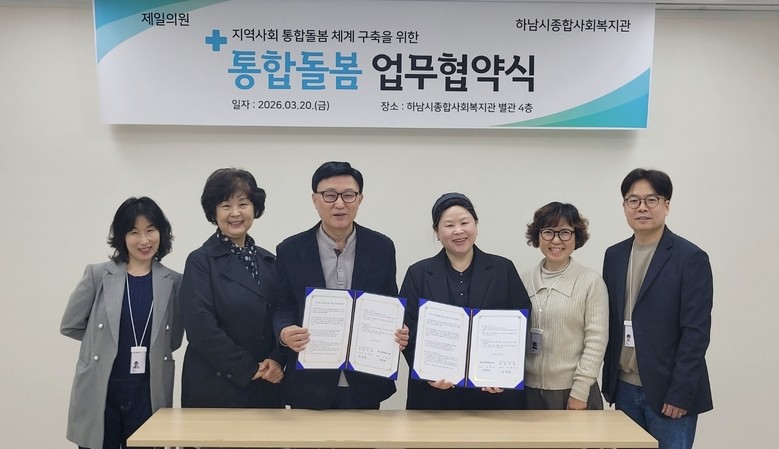 [하남시 세계타임즈=송민수 기자] 하남시종합사회복지관(관장 김혜성)과 하남시 재택의료센터로 지정된 제일의원(원장 김영철)은 지난 20일, 하남시 관내 돌봄 취약계층의 건강권 보장과 지역사회통합돌봄 체계 구축을 위한 업무협약을 체결했다고 밝혔다.