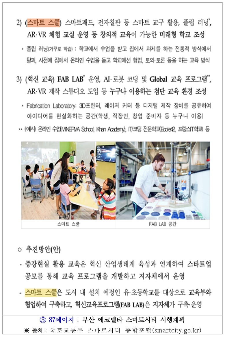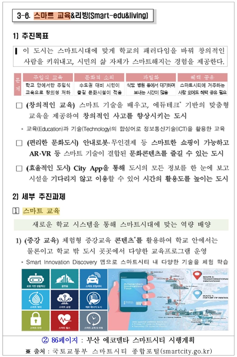 ◈ 국토부 스마트시티 종합포털에 게시된 ‘부산 에코델타 스마트시티 시행계획’을 보면, ‘10대 혁신 서비스’에 ‘스마트 학교’와 ‘스마트 교육’이 분명히 포함돼 있으며, AR·VR 체험교실 운영 등