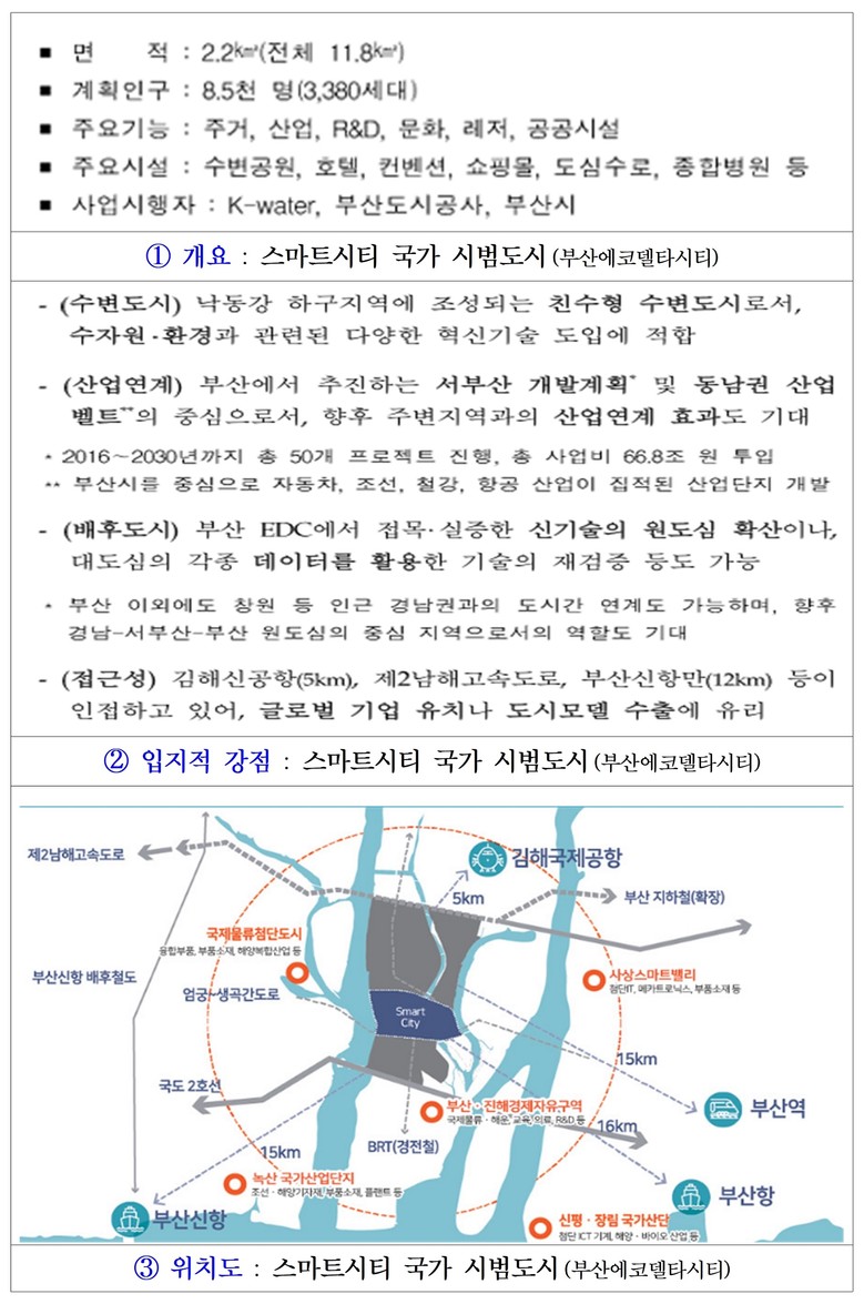 이종환 의원은 “2018년 1월 정부는, 4차 산업혁명 관련 신기술을 실증·접목하고 혁신 산업 생태계 조성 및 미래스마트시티 선도모델을 제시하고자 부산에코델타시티(세물머리지역 중심, 84만평)를 스마트시티 국가 시범도시(상세내용 : 아래)로 선정한 바 있다.”라며, “당초 수립된 계획에는 스마트시티 국가 시범도시에 설립될 에코6초등학교를 ‘스마트 학교로 설립’하겠다는 내용이 포함된 바 있다.”라고 설명했다.