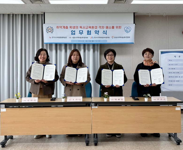 9일 경기도교육청평생학습관에서 열린 협약식에는 류영신 평생학습관장과 시흥·안산·안성지역아동센터협의(연합)회 회장 등 주요 관계자들이 참석해 취약계층 학생들의 독서 기반 교육환경을 개선하고 지역 간 교육 격차를 해소하는 데 힘을 모으기로 약속했다.