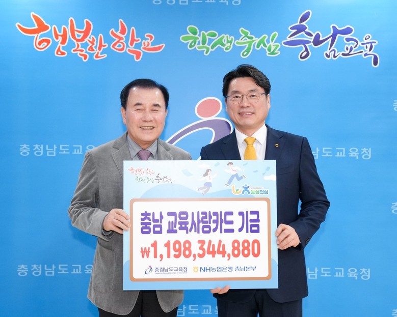 [충남 세계타임즈=이현진 기자] 충남교육청(교육감 김지철)은 25일(수) 도교육청 접견실에서 엔에이치(NH)농협은행 충남본부(본부장 오주현)로부터 지난해 교직원과 학교의 사용으로 조성된 충남교육사랑카드 기금 11억 9천만 원을 전달받았다.