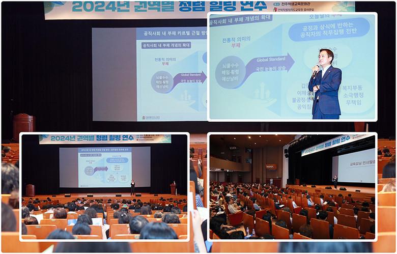 이날 전주에서 시작한 청렴 힐링 연수는 △30일 정읍·부안·고창권역 △8월 5일 남원·장수·임실·순창권역 △8월 6일 군산·익산권역 △8월 7일 완주·김제·무주·진안권역으로 나뉘어 총 4회 운영된다.