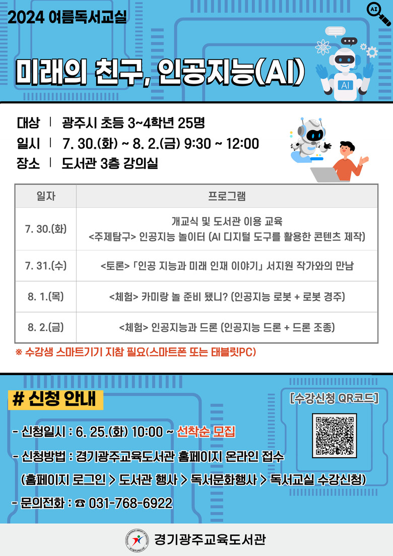 ◦ 6월 25일 10시부터 참여 희망 학생 누리집에서 선착순 접수 가능 [경기도 세계타임즈=송민수 기자] 경기광주교육도서관(관장 정영숙)은 다음달 30일부터 8월 2일까지 4일간 광주지역 초등 3~4학년 학생들을 위한 여름독서교실 프로그램 ‘미래의 친구, 인공지능(AI)’을 운영한다고 밝혔다.