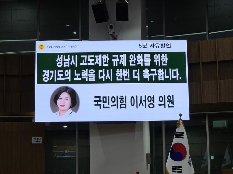 5분자유발언에 나선 이서영 의원은 “성남시, 특히 45미터이하 고도제한을 받고 있는 분당 1기 신도시 일부지역 주민들은 고도제한 규제로 인해 「노후계획도시 정비 및 지원에 관한 특별법」(이하 “「특별법」”이라 함)에서 용적률을 최대 500%까지 확대할 수 있도록 한 인센티브를 적용받지 못하는 것은 아닌지 가슴 졸이며, 상대적 박탈감에 허탈해 하고 있다”고 전하며, 김동연 지사가 후보 시절 발표한 성남시 3대 공약의 이행 여부, 고도제한 규제완화를 위한 구체적 방안이 있는지, 특별법의 인센티브를 제대로 적용받지 못할 경우 어떻게 할 것인지 등에 대해 답변을 요구했다.
