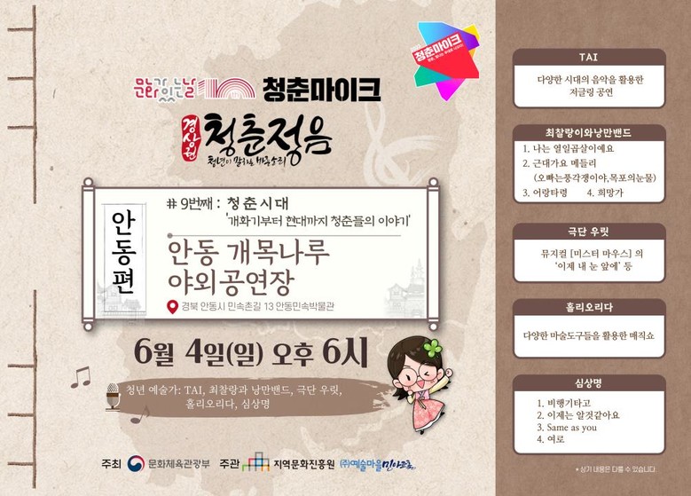 [안동시 세계타임즈=한성국 기자] 문화체육관광부가 주최하고 지역문화진흥원이 주관하는「2023 문화가 있는 날」‘청춘마이크’ 안동 편이 6월 4일 개목나루 야외공연장에서 펼쳐진다.