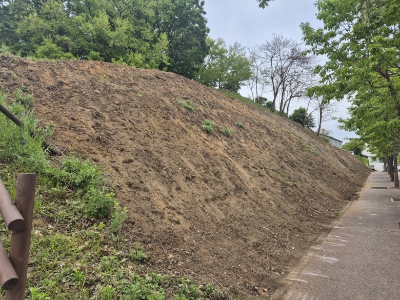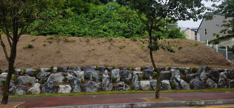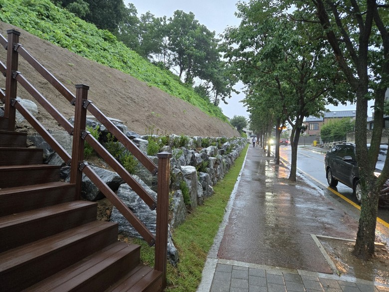 시는 공원 비탈면에서 흙과 모래가 인도로 흘러내리는 것을 방지하기 위해 비탈면 하부에 조경석을 쌓았다. 빗물이 원활히 흘러갈 수 있도록 배수로도 설치했다.