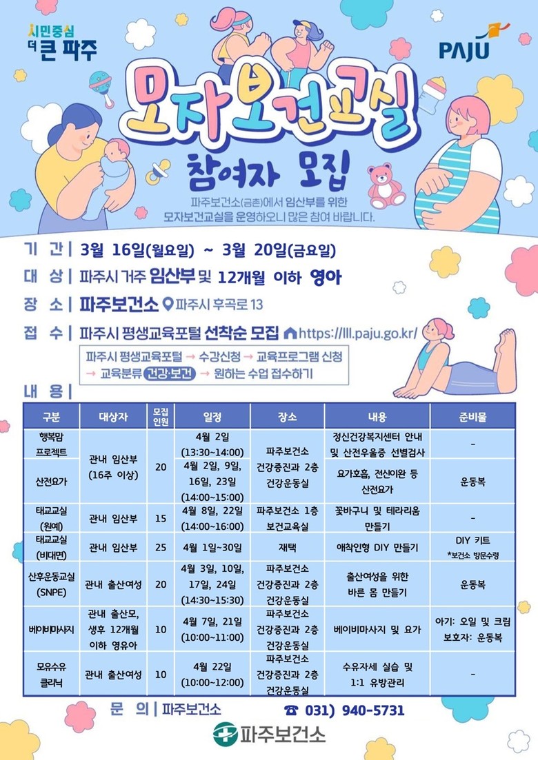 자세한 사항은 파주시 평생교육포털에서 확인하거나 파주보건소 모자보건팀(☎031- 940-5731)으로 문의하면 된다.