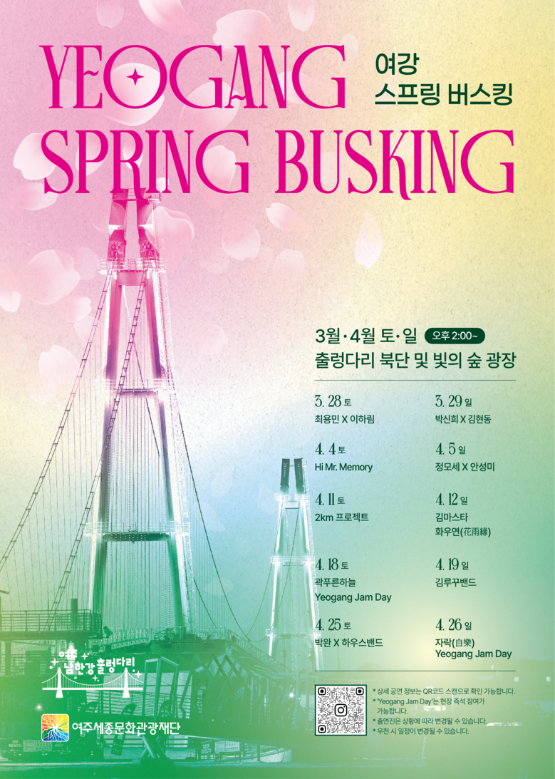 이번 버스킹 공연은 오는 3월 28일부터 6월 28일까지 매주 토요일과 일요일 오후 2시부터 정기 공연을 운영해 방문객에게 음악과 함께하는 여유로운 휴식시간을 제공하고, 여주 대표 관광지인 여주 남한강 출렁다리와 빛의 숲, 주변 문화관광 자원을 널리 알리기 위해 마련됐다. 현장에서는 관내 소상공인·청년 창업가 등이 참여하는 플리마켓을 함께 운영해 공연 관람과 더불어 다양한 먹거리·볼거리·살거리를 동시에 즐길 수 있도록 할 예정이다.