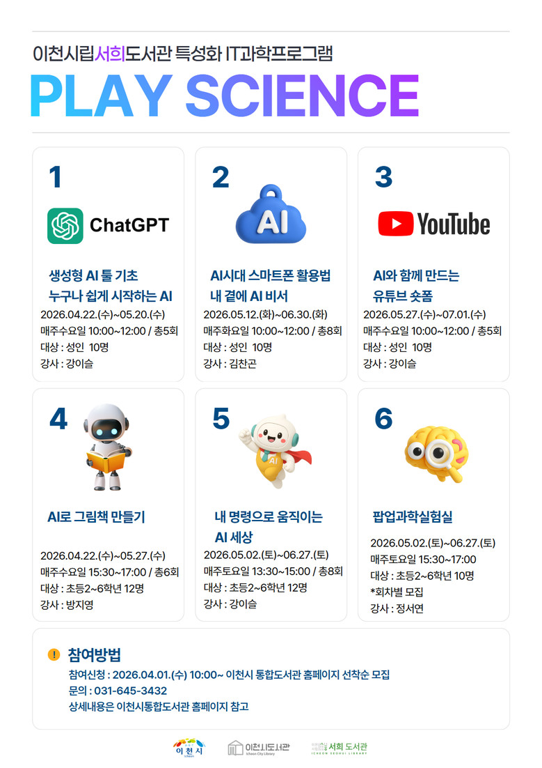 서희도서관 정보기술(IT).과학 프로그램 참여 신청 및 자세한 내용은 이천시통합도서관 누리집을 통해 확인할 수 있다.