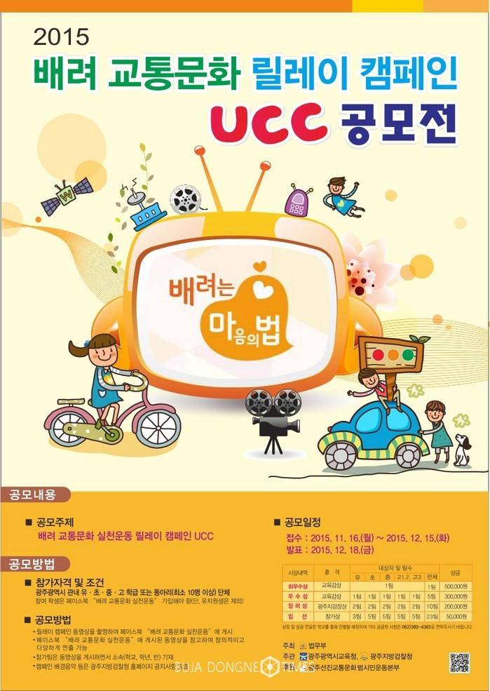 [광주=세계타임즈 손권일 기자]서로 존중하고 배려하는 교통문화 확산을 위해 광주광역시교육청과 광주지방검찰청 공동 주관으로 광주광역시 관내 유·초·중·고(고1,2, 고3) 학생들을 5개 그룹으로 나누어 시상하는 『2015배려 교통문화 릴레이 캠페인 UCC 공모전』을 실시한다.