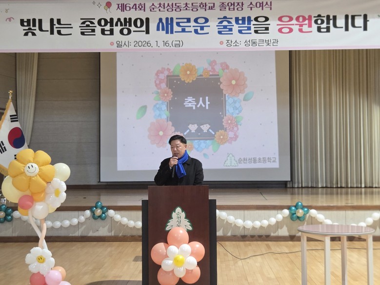 김 위원장은 “졸업생 여러분은 성동초등학교에서 지식뿐 아니라 친구와 함께하는 기쁨, 서로를 존중하고 배려하는 마음을 배워 왔다”라며, “그동안 쌓아 온 따뜻한 인성과 바른 태도는 앞으로 어떤 길을 선택하더라도 여러분을 든든히 지켜 줄 소중한 힘이 될 것”이라고 강조했다.